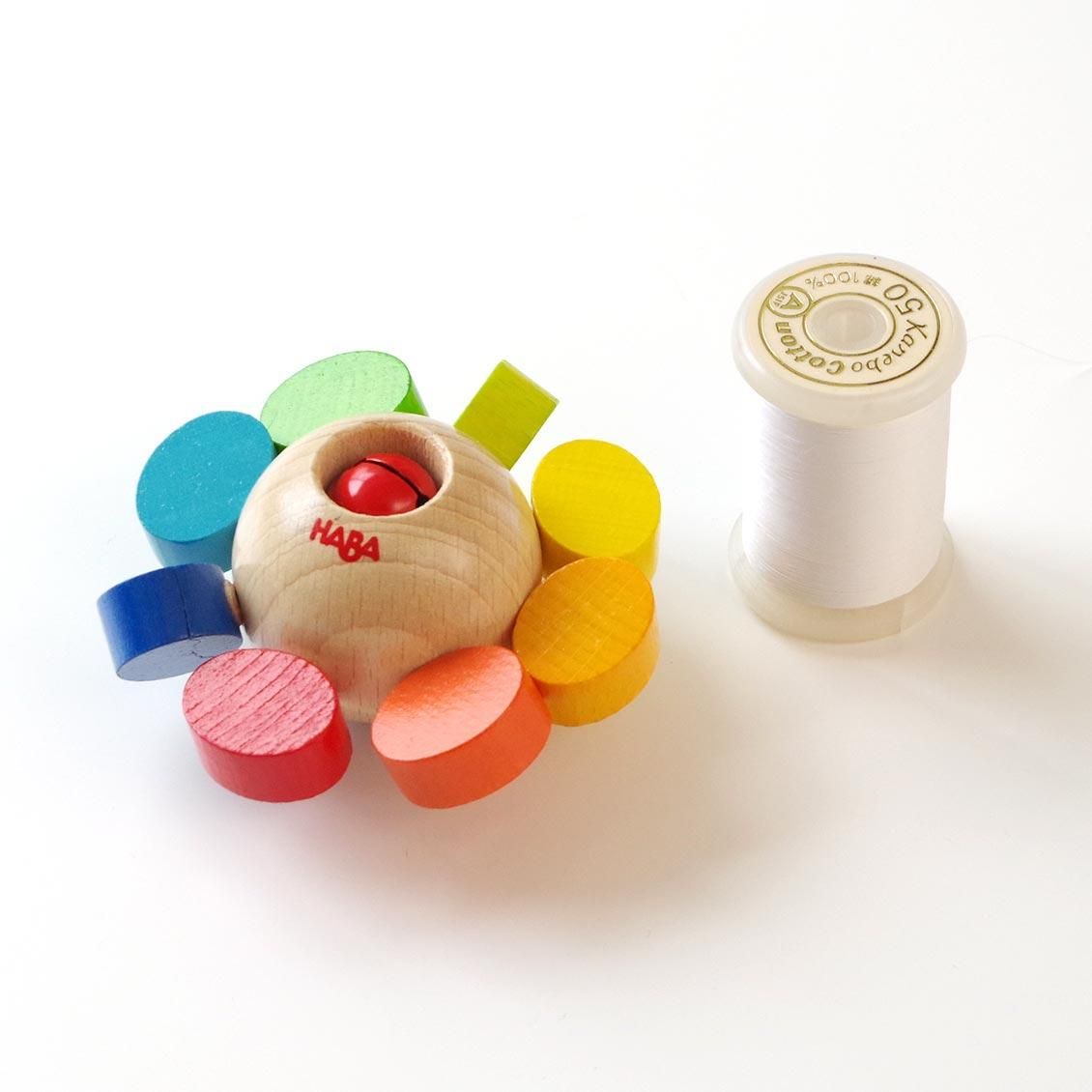 「ラトル・カラーフラワー」は、ゴルフボールくらいの大きさの木玉にカラフルな花びらがついた、かわいいお花の形の木製ラトルです。